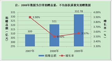 書中明確表示:2009年全國接收捐贈總量超過 332.74億元,而2008年全年捐贈總量超過1070億元,但2008年是一個特殊的年份,救災捐贈超過捐贈總量的七成,常規(guī)捐贈量約為321億元,2007年我國接收國內外各類社會捐贈總量309億元,如此來比較的話,2009年全國的捐贈情況同2007年相比,增長率為7.5%,如果同2008年日常捐贈總量321億元相比,仍有3.5%的增長率。(見圖1)